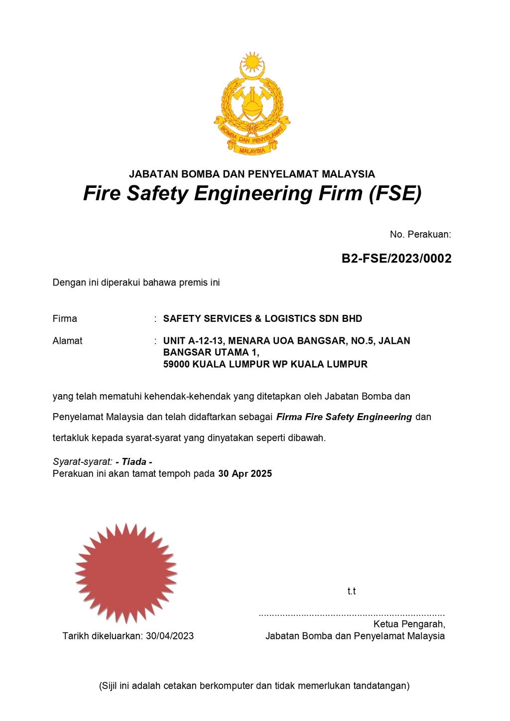 Safety Services & Logistics Sdn Bhd (SSL) is a fire & safety engineering specialist since 2003. The company core activities are fire and safety strategy development, fire engineering deterministic assessment, risk analysis modeling, fire and smoke modelling, code compliance services and matters related to the fire authority (BOMBA).